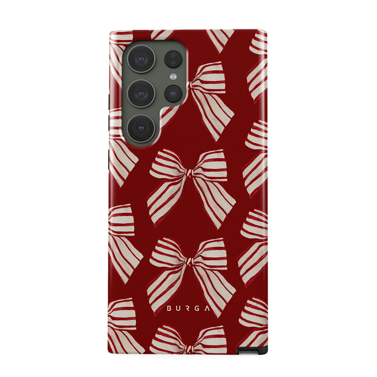 El diseño presenta: moños, rayas, rojo, blanco, motivos navideños.