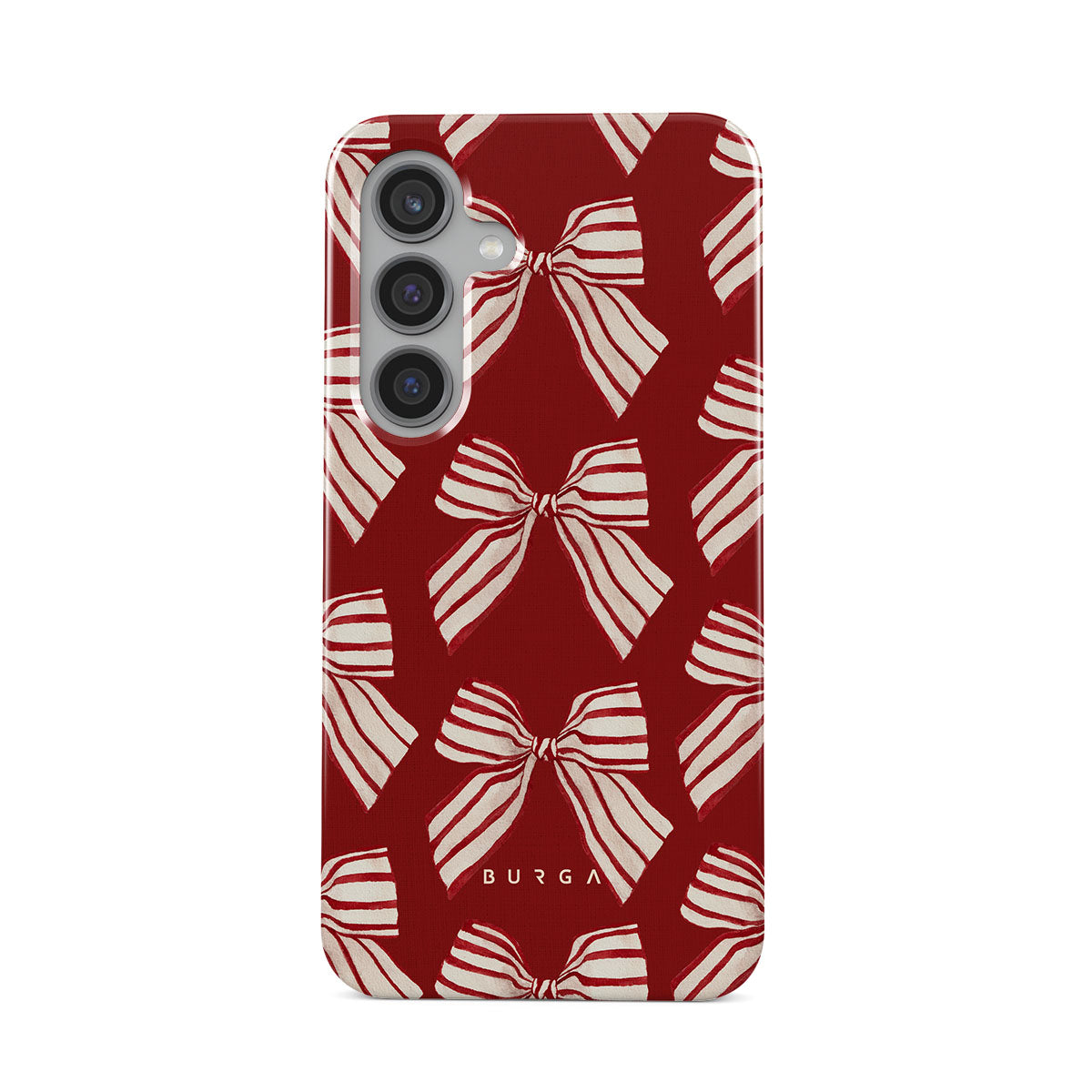 El diseño presenta: moños, rayas, rojo, blanco, motivos navideños.