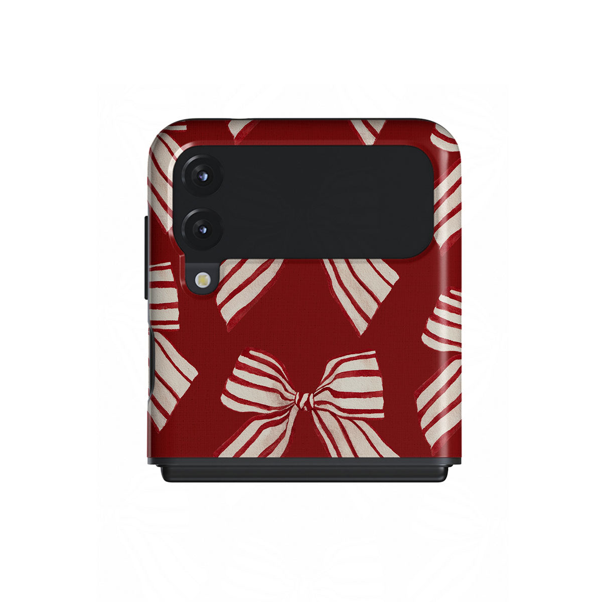 El diseño presenta: moños, rayas, rojo, blanco, motivos navideños.