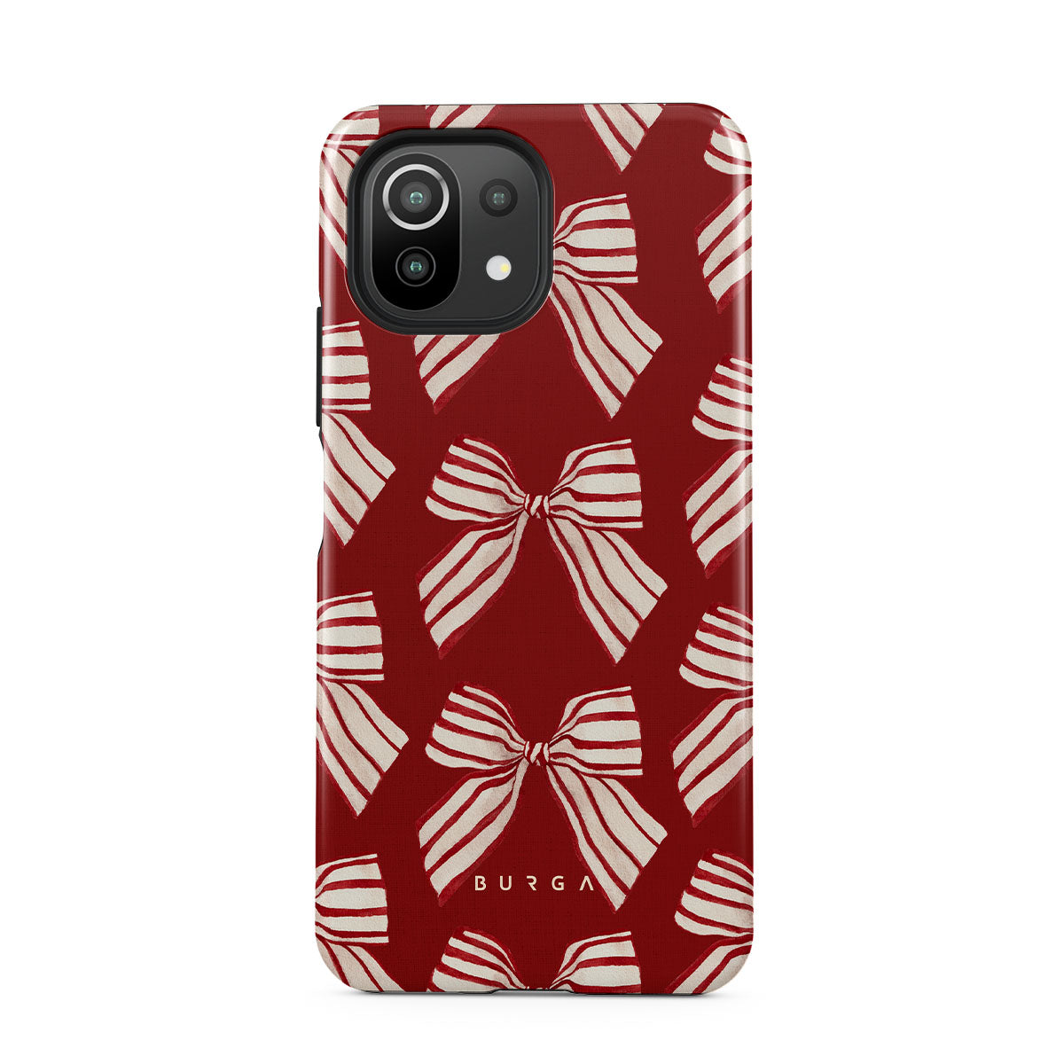 El diseño presenta: moños, rayas, rojo, blanco, motivos navideños.