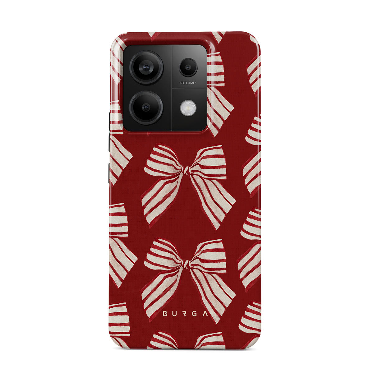 El diseño presenta: moños, rayas, rojo, blanco, motivos navideños.