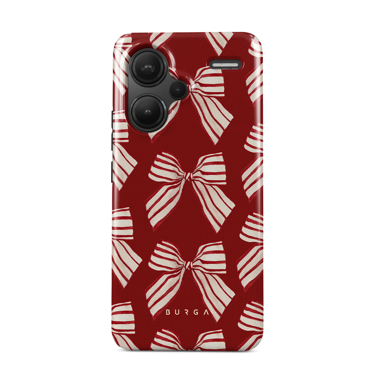 El diseño presenta: moños, rayas, rojo, blanco, motivos navideños.