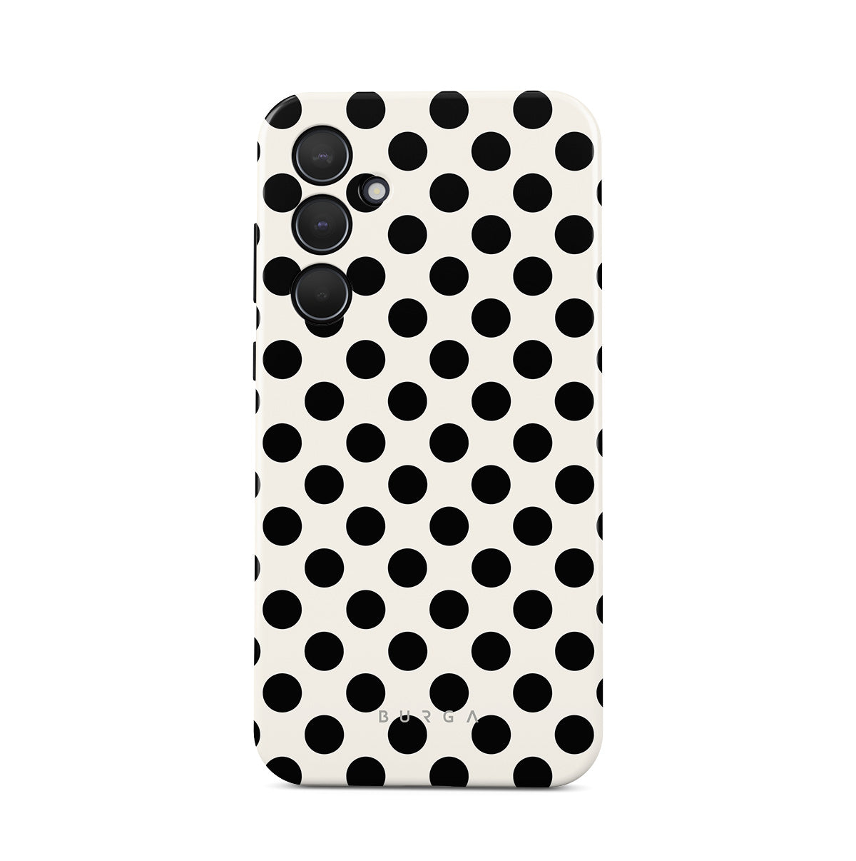 En este diseño: lunares negros sobre un fondo blanco limpio.
