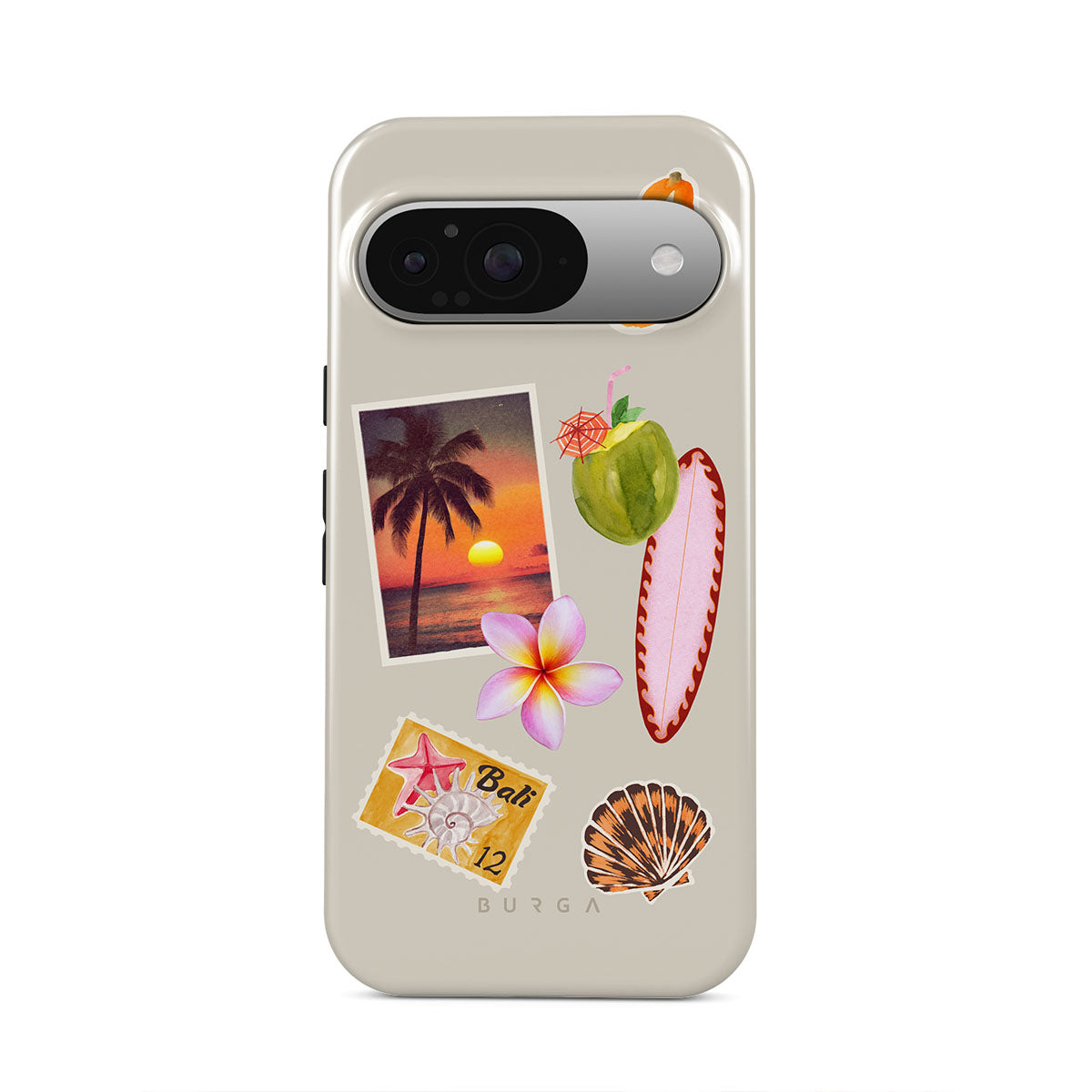 En este diseño: foto de atardecer tropical, papaya, coco verde, tabla de surf rosa, flor de plumeria rosa, concha naranja, postal de Bali.
