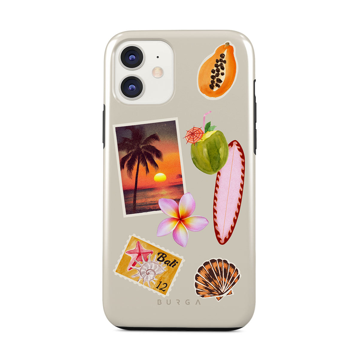 En este diseño: foto de atardecer tropical, papaya, coco verde, tabla de surf rosa, flor de plumeria rosa, concha naranja, postal de Bali.