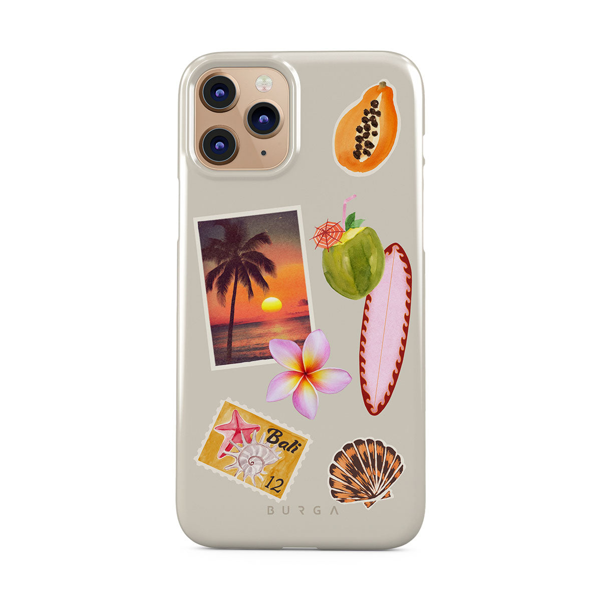 En este diseño: foto de atardecer tropical, papaya, coco verde, tabla de surf rosa, flor de plumeria rosa, concha naranja, postal de Bali.