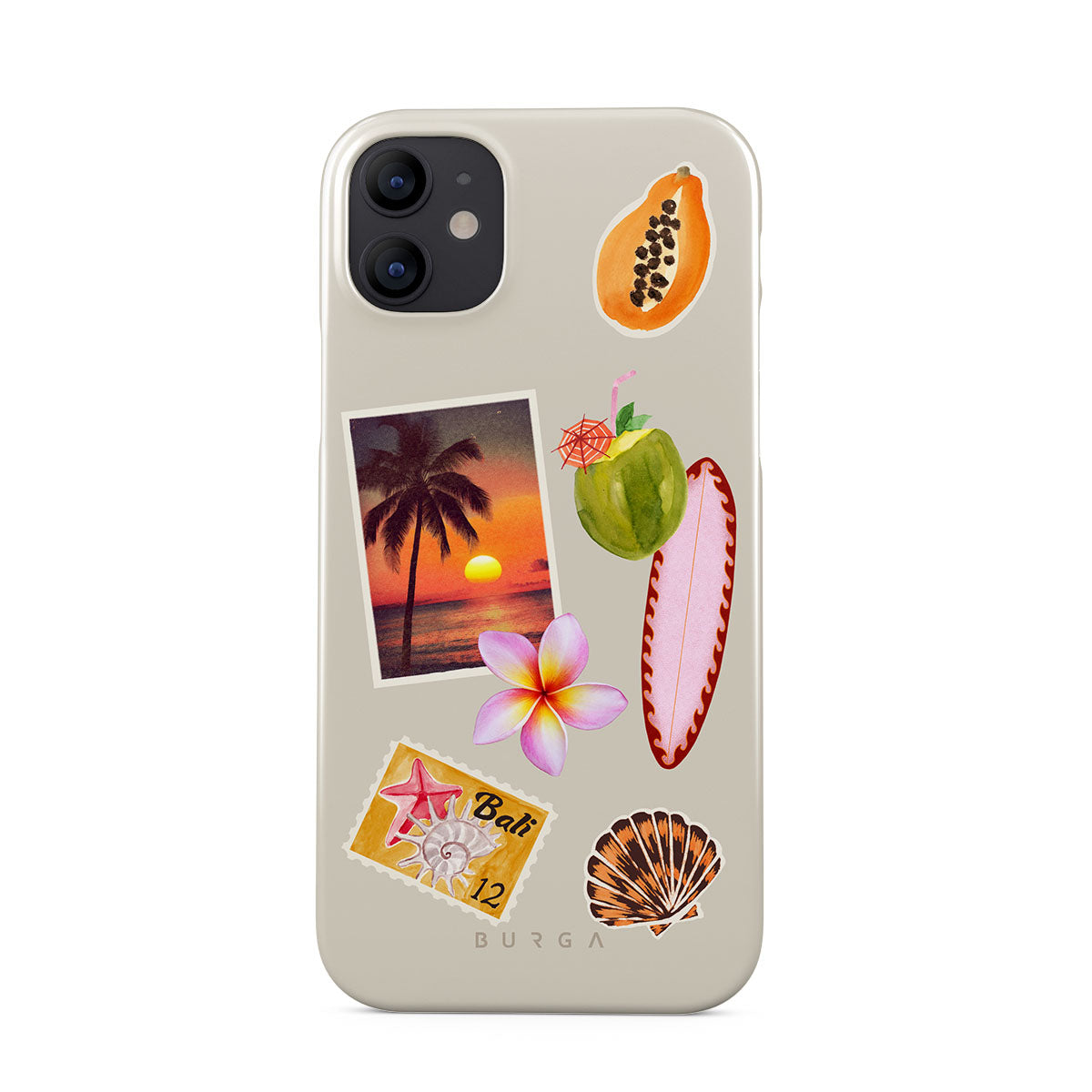 En este diseño: foto de atardecer tropical, papaya, coco verde, tabla de surf rosa, flor de plumeria rosa, concha naranja, postal de Bali.