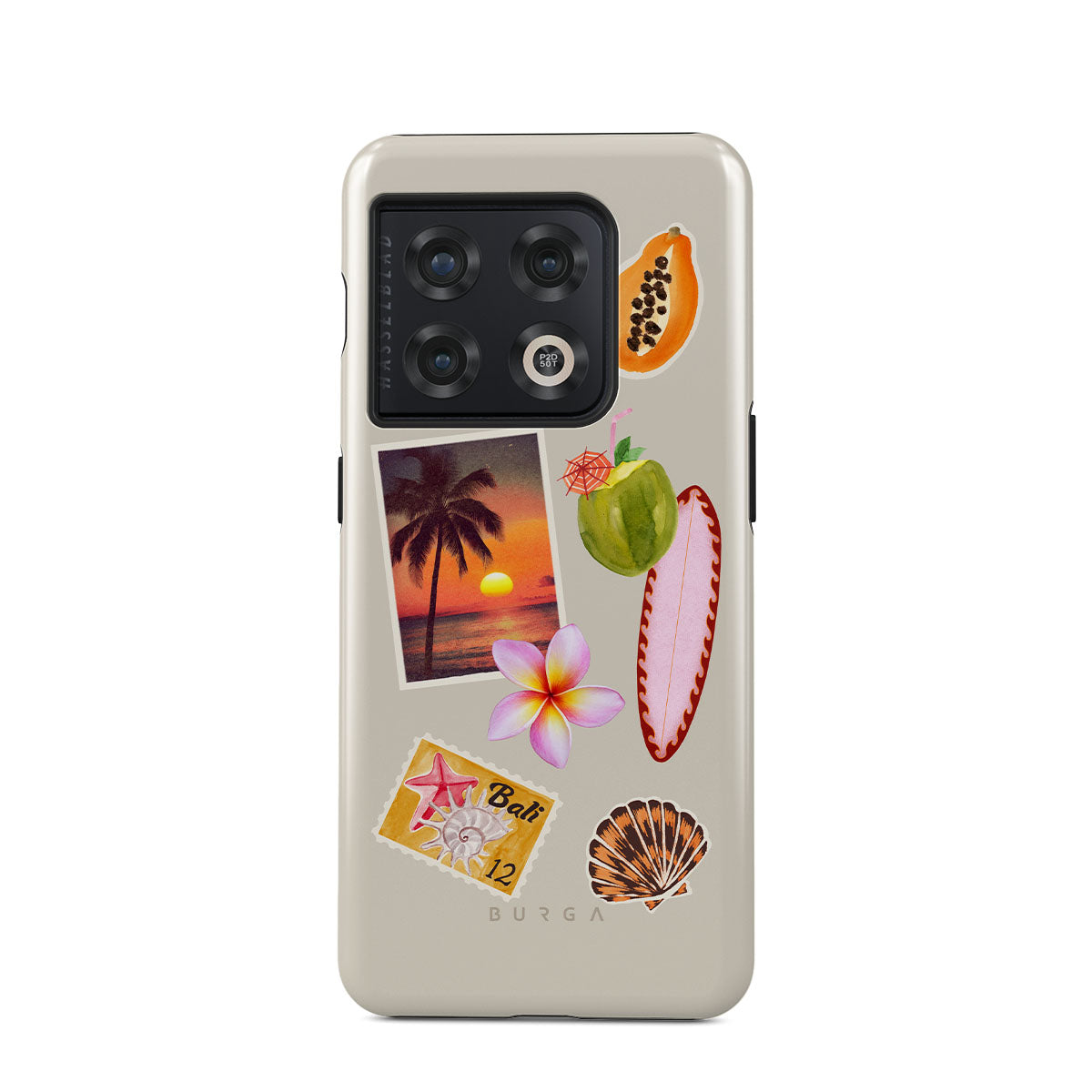 En este diseño: foto de atardecer tropical, papaya, coco verde, tabla de surf rosa, flor de plumeria rosa, concha naranja, postal de Bali.