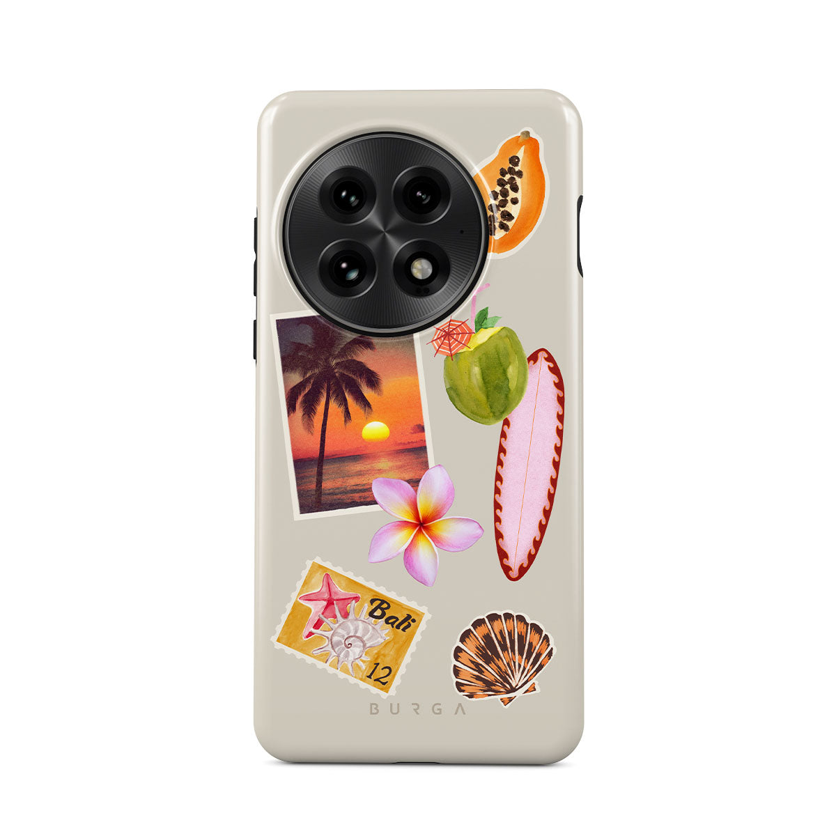 En este diseño: foto de atardecer tropical, papaya, coco verde, tabla de surf rosa, flor de plumeria rosa, concha naranja, postal de Bali.