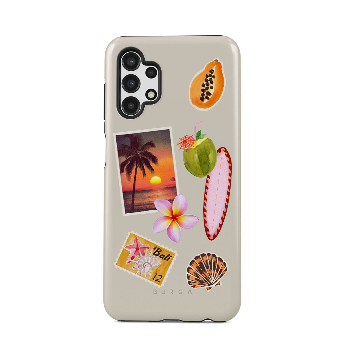 En este diseño: foto de atardecer tropical, papaya, coco verde, tabla de surf rosa, flor de plumeria rosa, concha naranja, postal de Bali.