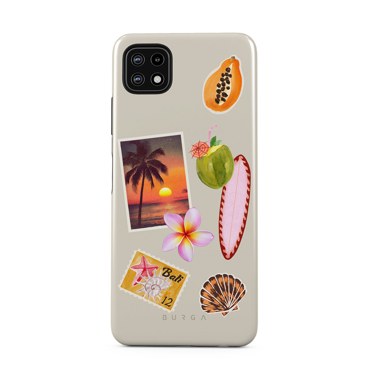 En este diseño: foto de atardecer tropical, papaya, coco verde, tabla de surf rosa, flor de plumeria rosa, concha naranja, postal de Bali.