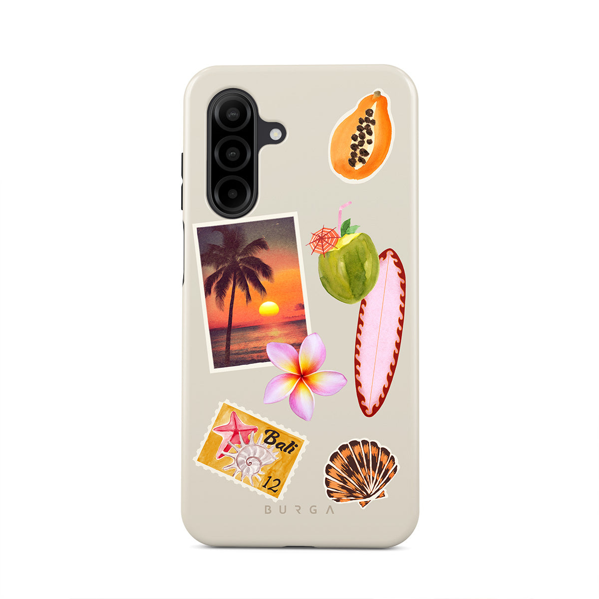 En este diseño: foto de atardecer tropical, papaya, coco verde, tabla de surf rosa, flor de plumeria rosa, concha naranja, postal de Bali.