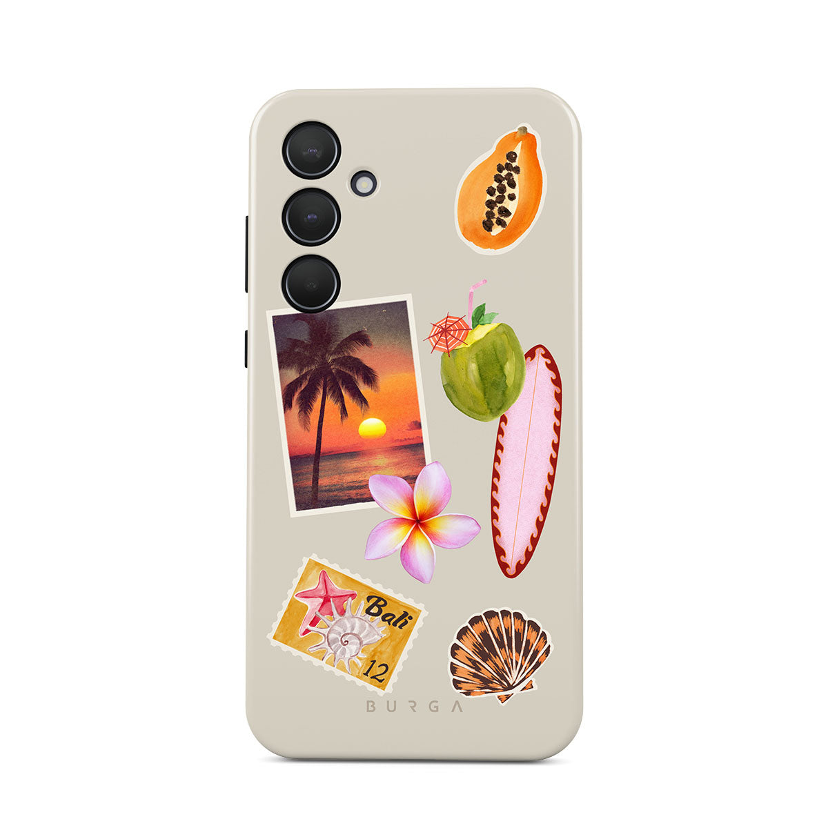 En este diseño: foto de atardecer tropical, papaya, coco verde, tabla de surf rosa, flor de plumeria rosa, concha naranja, postal de Bali.