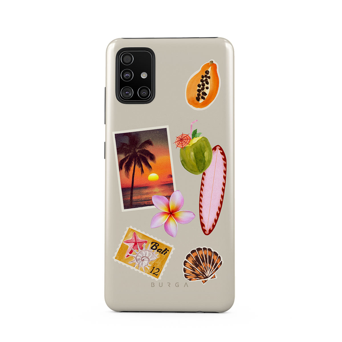 En este diseño: foto de atardecer tropical, papaya, coco verde, tabla de surf rosa, flor de plumeria rosa, concha naranja, postal de Bali.
