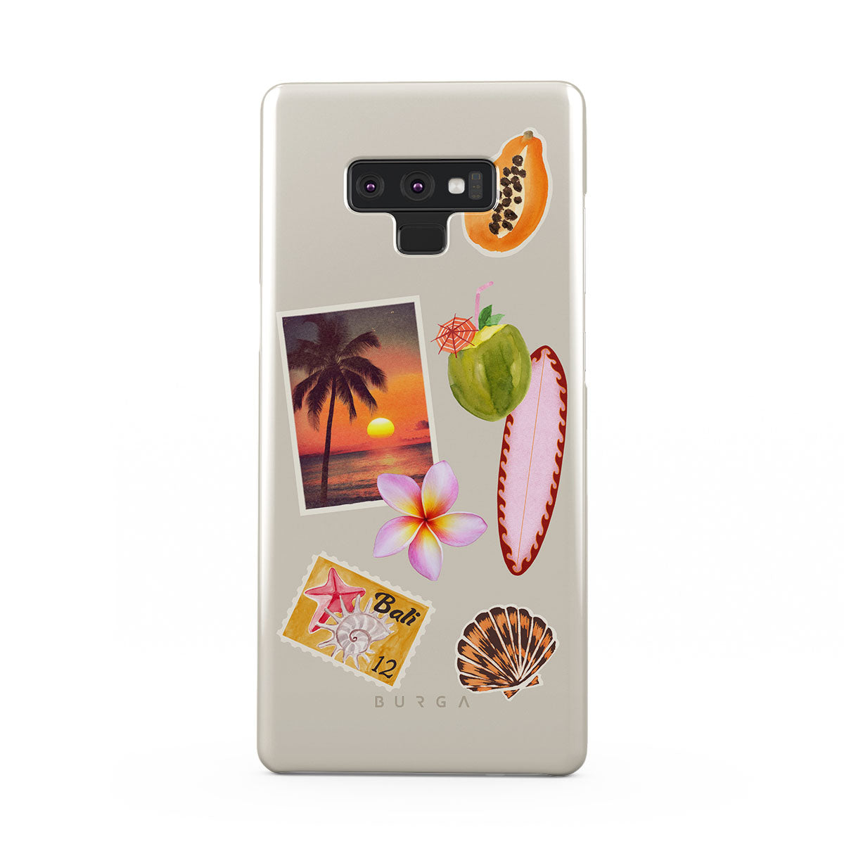 En este diseño: foto de atardecer tropical, papaya, coco verde, tabla de surf rosa, flor de plumeria rosa, concha naranja, postal de Bali.