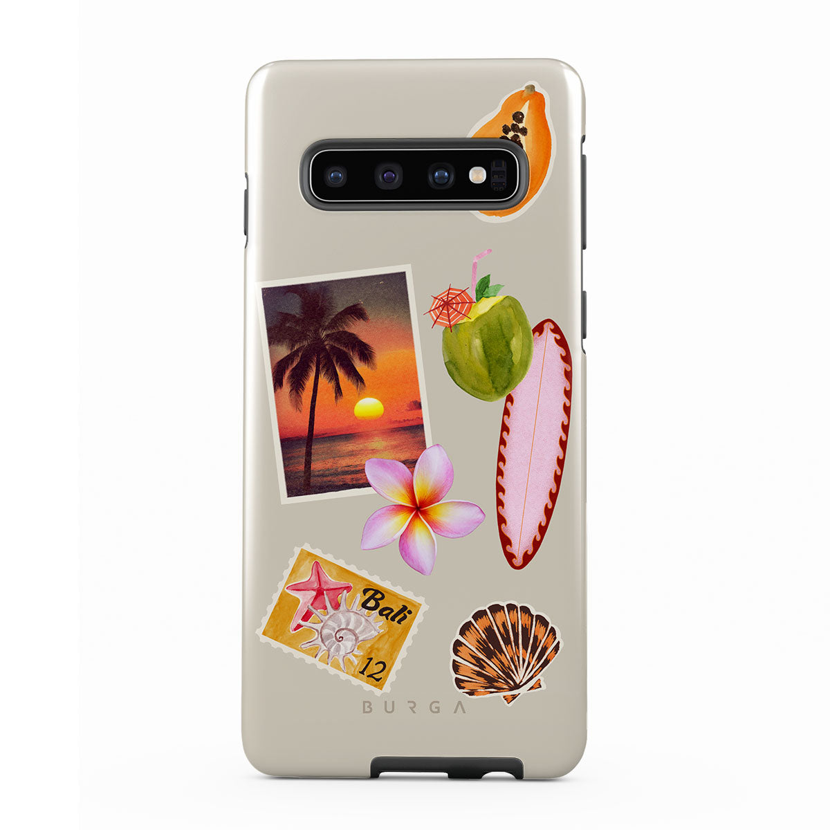 En este diseño: foto de atardecer tropical, papaya, coco verde, tabla de surf rosa, flor de plumeria rosa, concha naranja, postal de Bali.