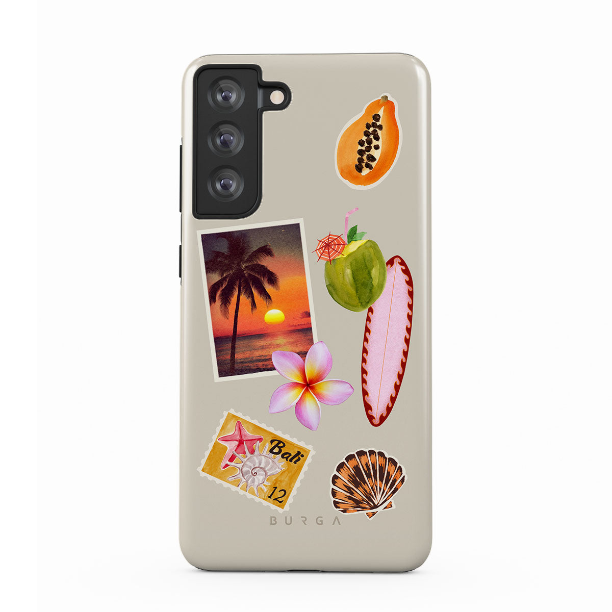 En este diseño: foto de atardecer tropical, papaya, coco verde, tabla de surf rosa, flor de plumeria rosa, concha naranja, postal de Bali.