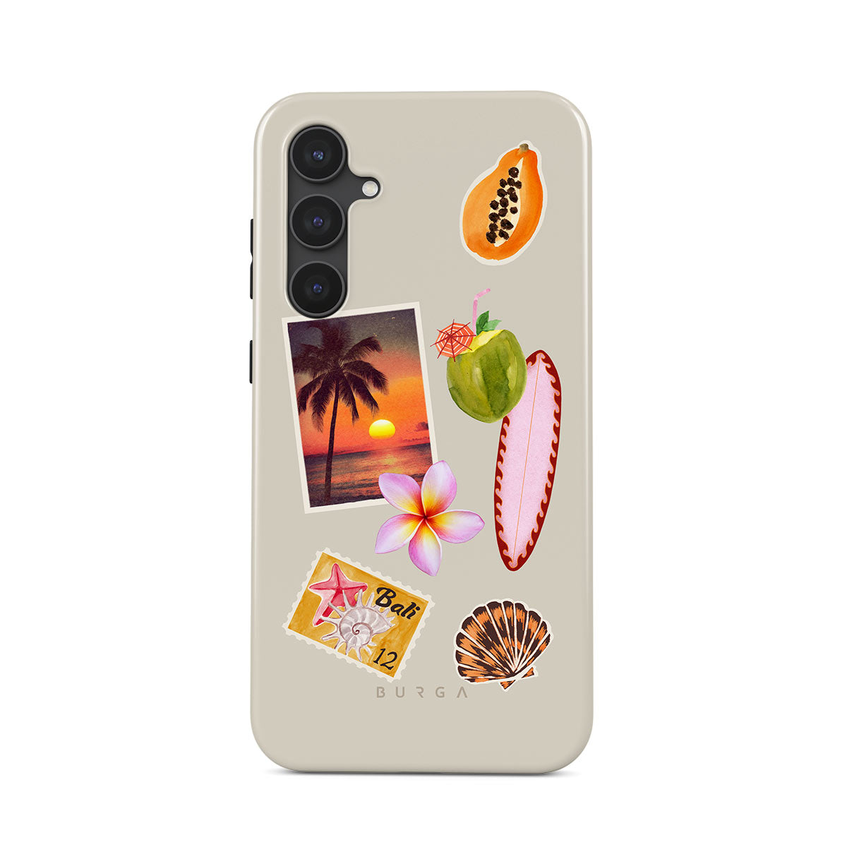 En este diseño: foto de atardecer tropical, papaya, coco verde, tabla de surf rosa, flor de plumeria rosa, concha naranja, postal de Bali.