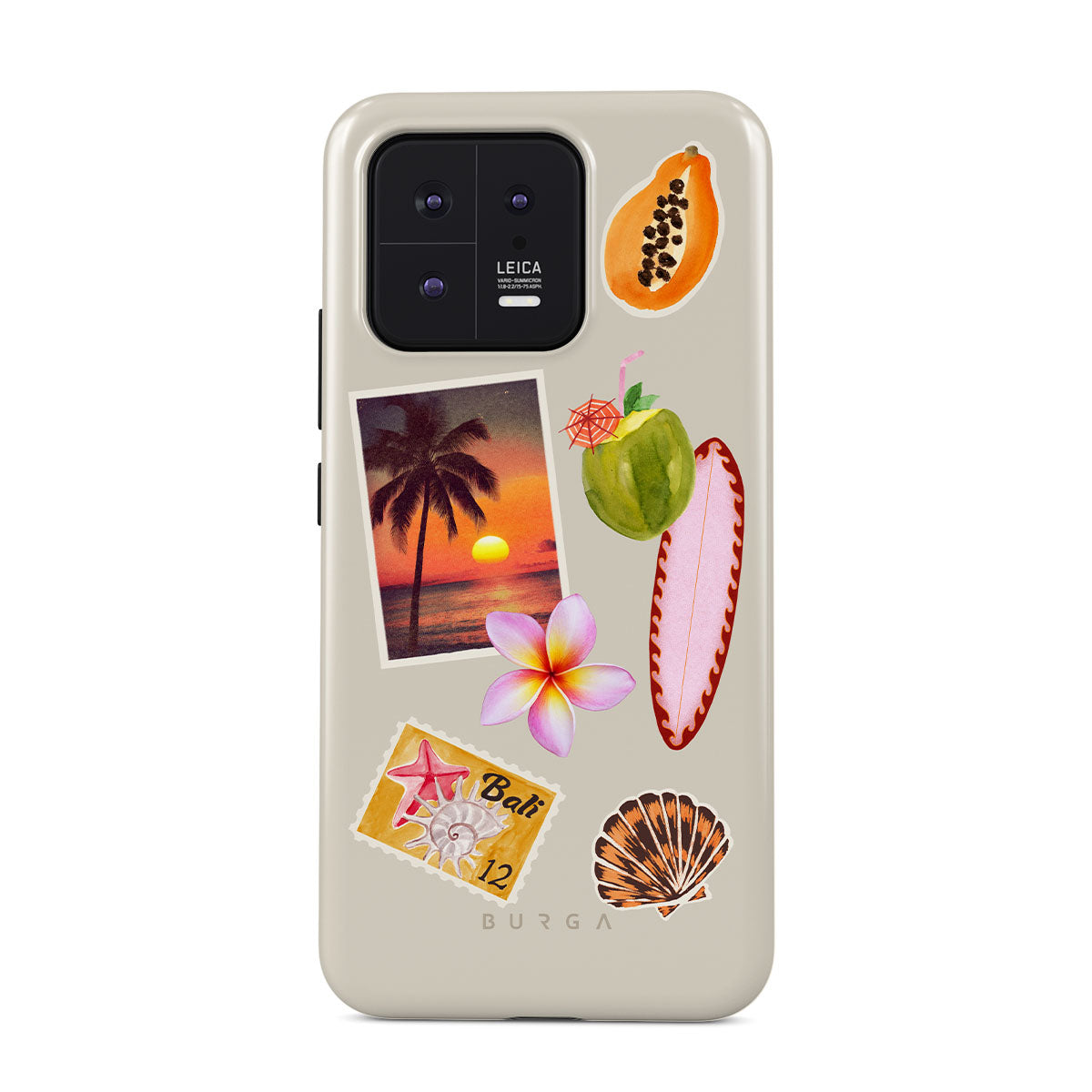 En este diseño: foto de atardecer tropical, papaya, coco verde, tabla de surf rosa, flor de plumeria rosa, concha naranja, postal de Bali.