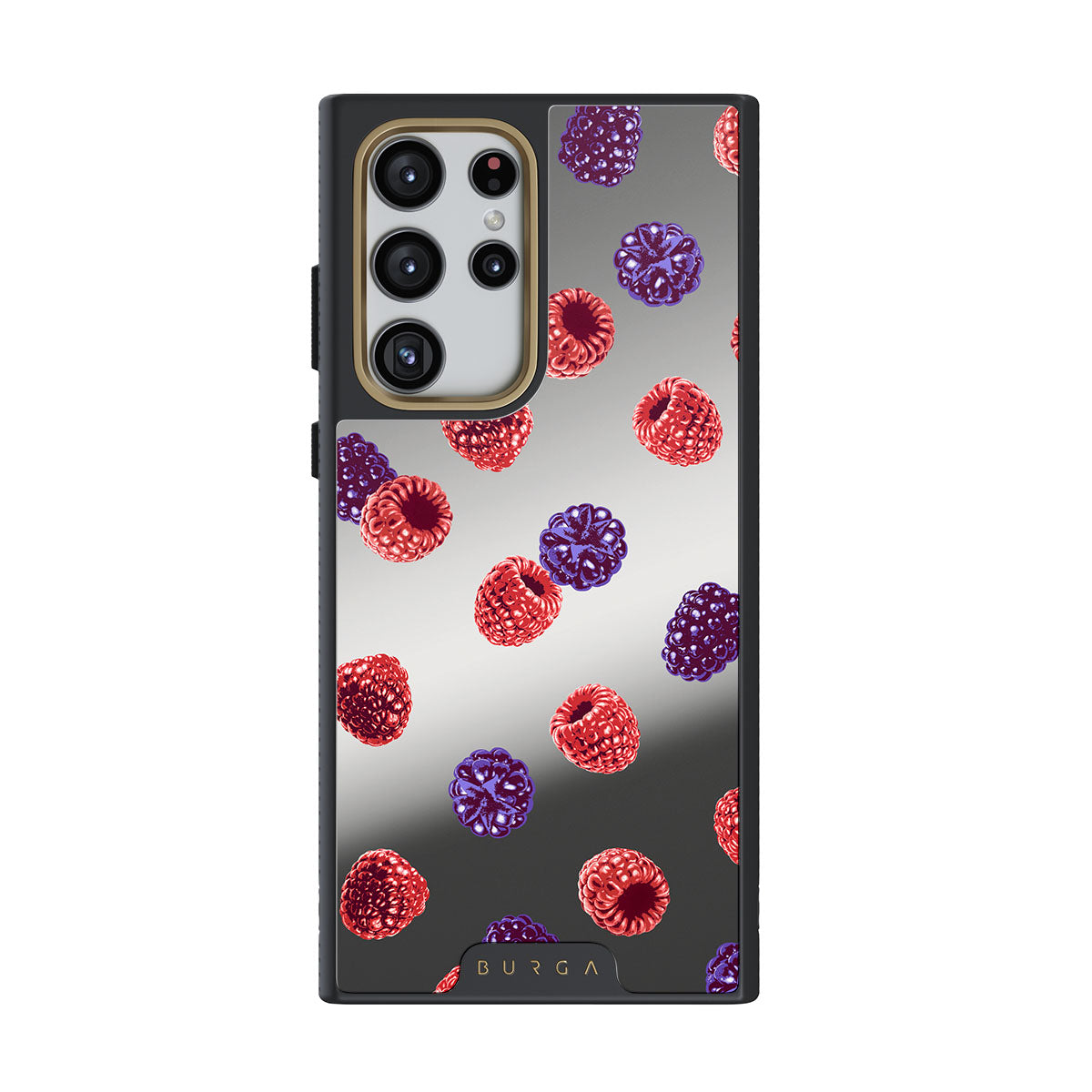 En este diseño: bayas, frambuesas, moras, frutas, espejo.