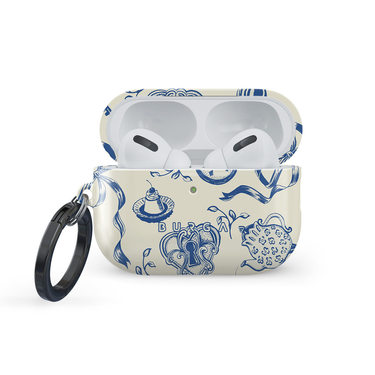 En este diseño: tazas de té, teteras, relojes de bolsillo, llave, corazones, cerámica, patrón azul y blanco.