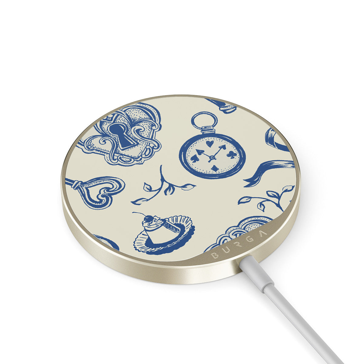 En este diseño: tazas de té, teteras, relojes de bolsillo, llave, corazones, cerámica, patrón azul y blanco