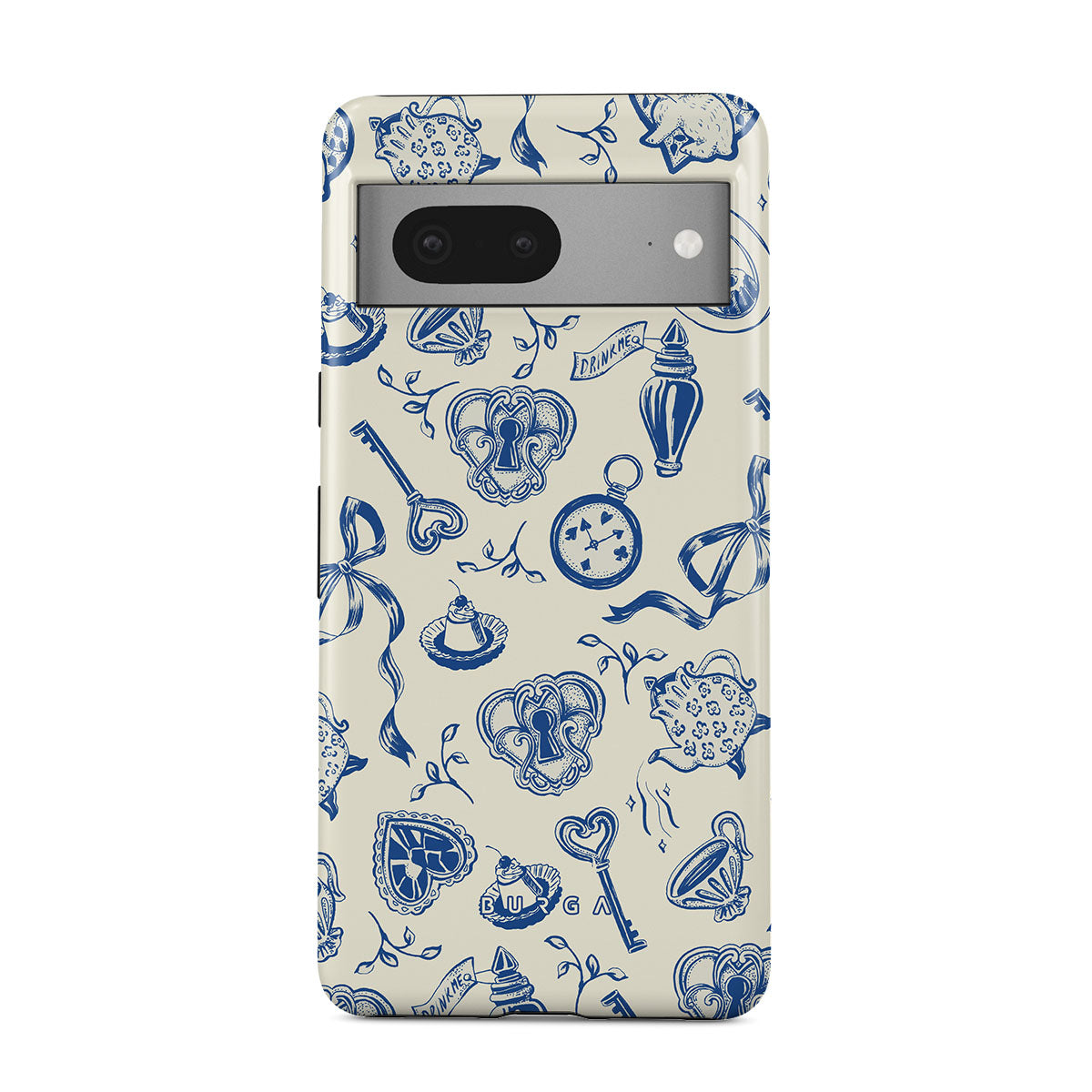 En este diseño: tazas de té, teteras, relojes de bolsillo, llave, corazones, cerámica, patrón azul y blanco.