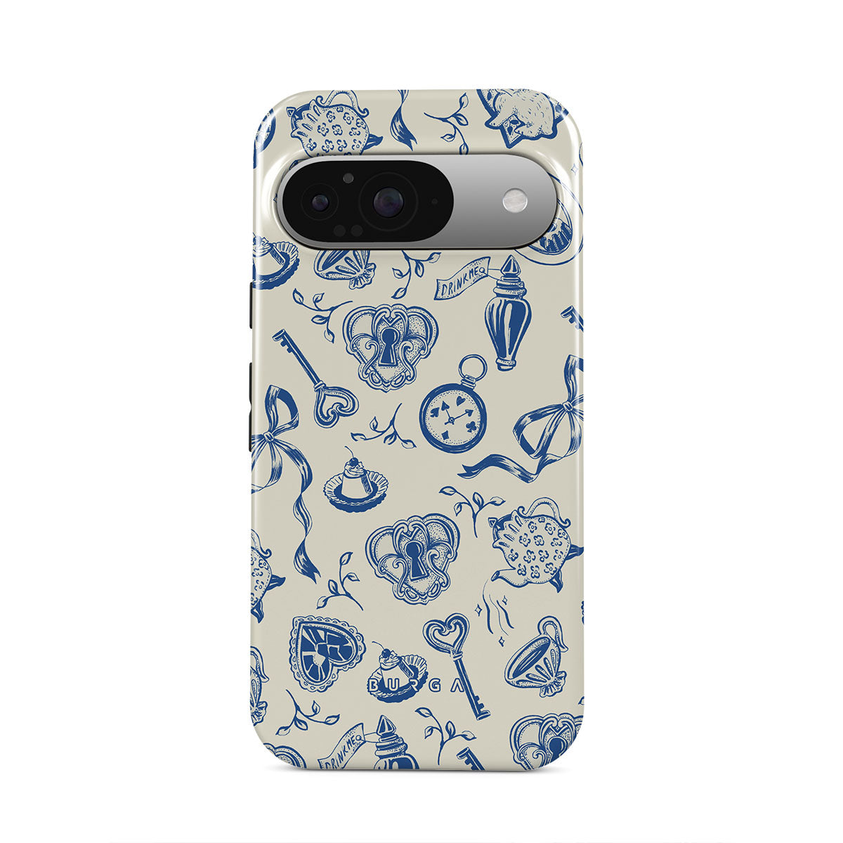 En este diseño: tazas de té, teteras, relojes de bolsillo, llave, corazones, cerámica, patrón azul y blanco.
