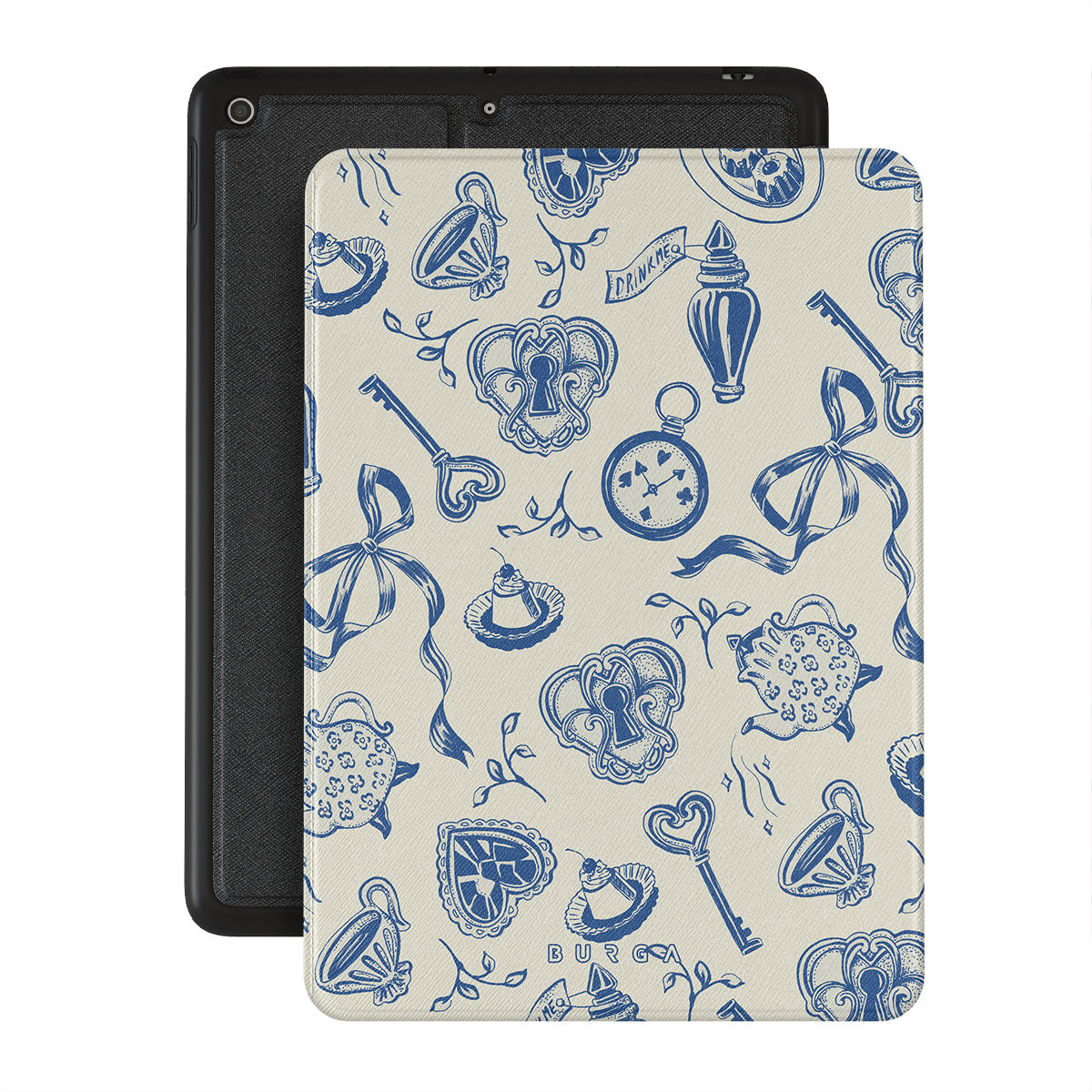 En este diseño: tazas de té, teteras, relojes de bolsillo, llave, corazones, cerámica, patrón azul y blanco.