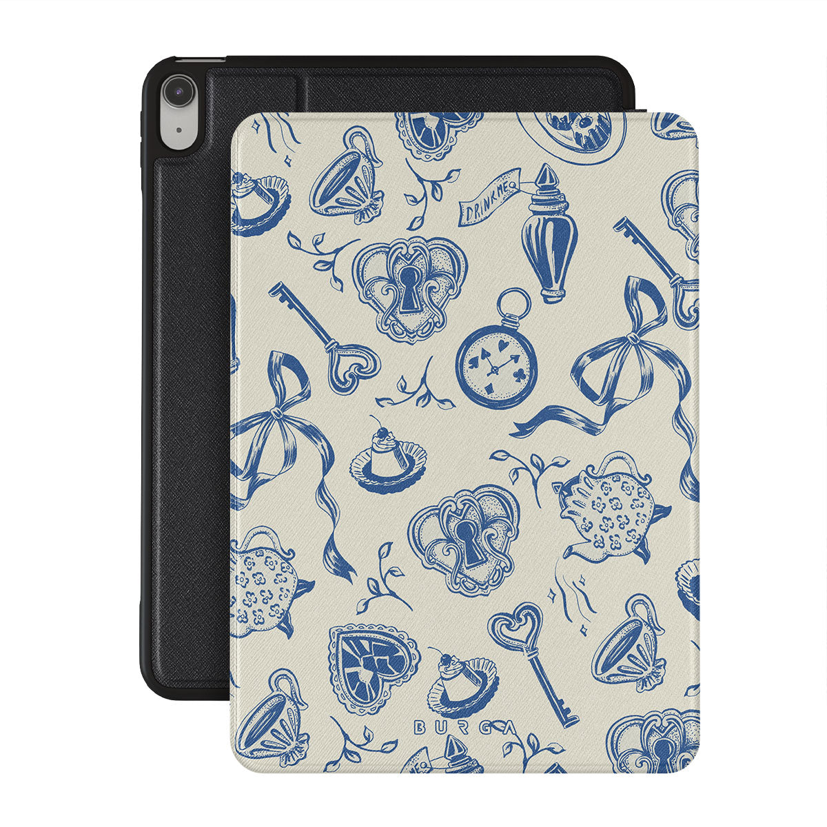 En este diseño: tazas de té, teteras, relojes de bolsillo, llave, corazones, cerámica, patrón azul y blanco.