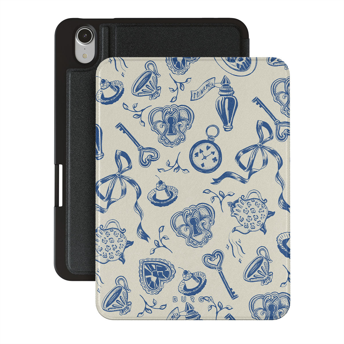 En este diseño: tazas de té, teteras, relojes de bolsillo, llave, corazones, cerámica, patrón azul y blanco.