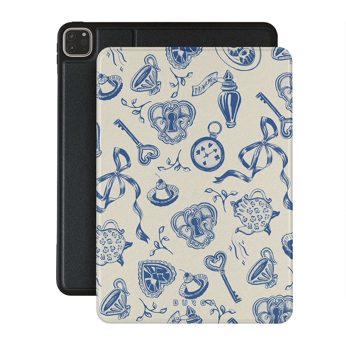 En este diseño: tazas de té, teteras, relojes de bolsillo, llave, corazones, cerámica, patrón azul y blanco.
