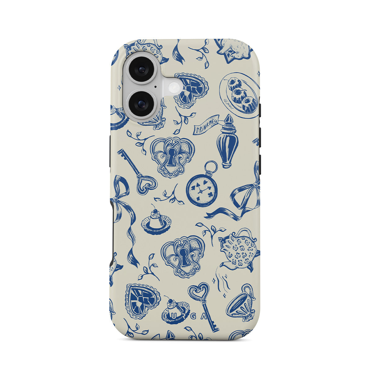 En este diseño: tazas de té, teteras, relojes de bolsillo, llave, corazones, cerámica, patrón azul y blanco.