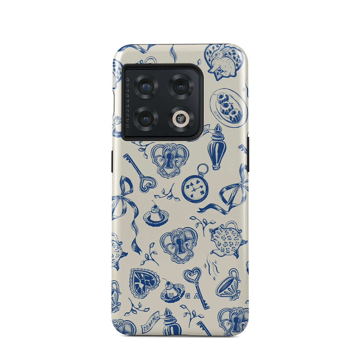 En este diseño: tazas de té, teteras, relojes de bolsillo, llave, corazones, cerámica, patrón azul y blanco.