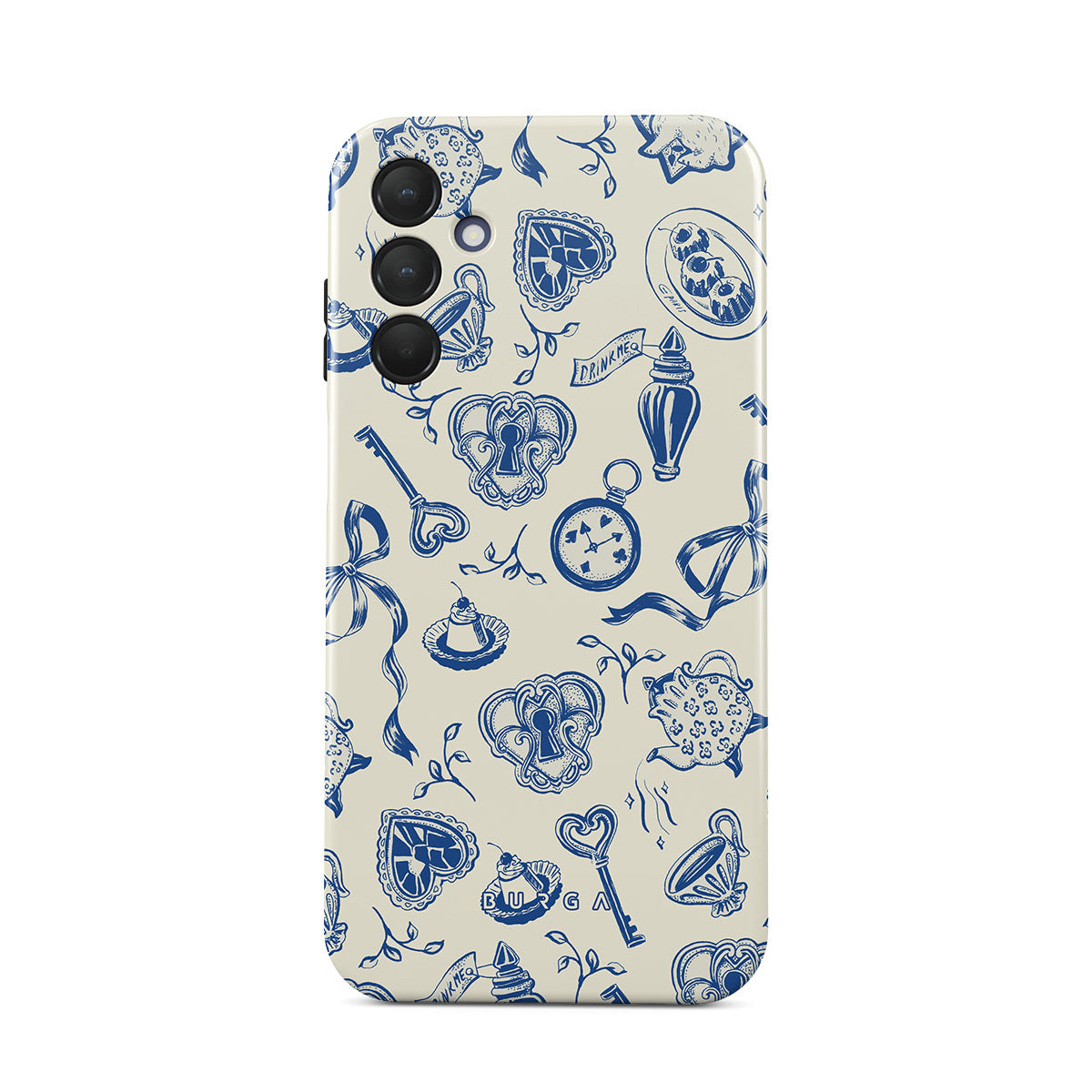 En este diseño: tazas de té, teteras, relojes de bolsillo, llave, corazones, cerámica, patrón azul y blanco.