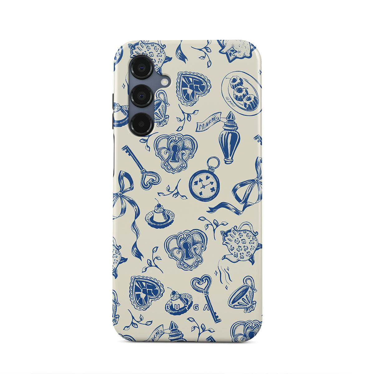 En este diseño: tazas de té, teteras, relojes de bolsillo, llave, corazones, cerámica, patrón azul y blanco.