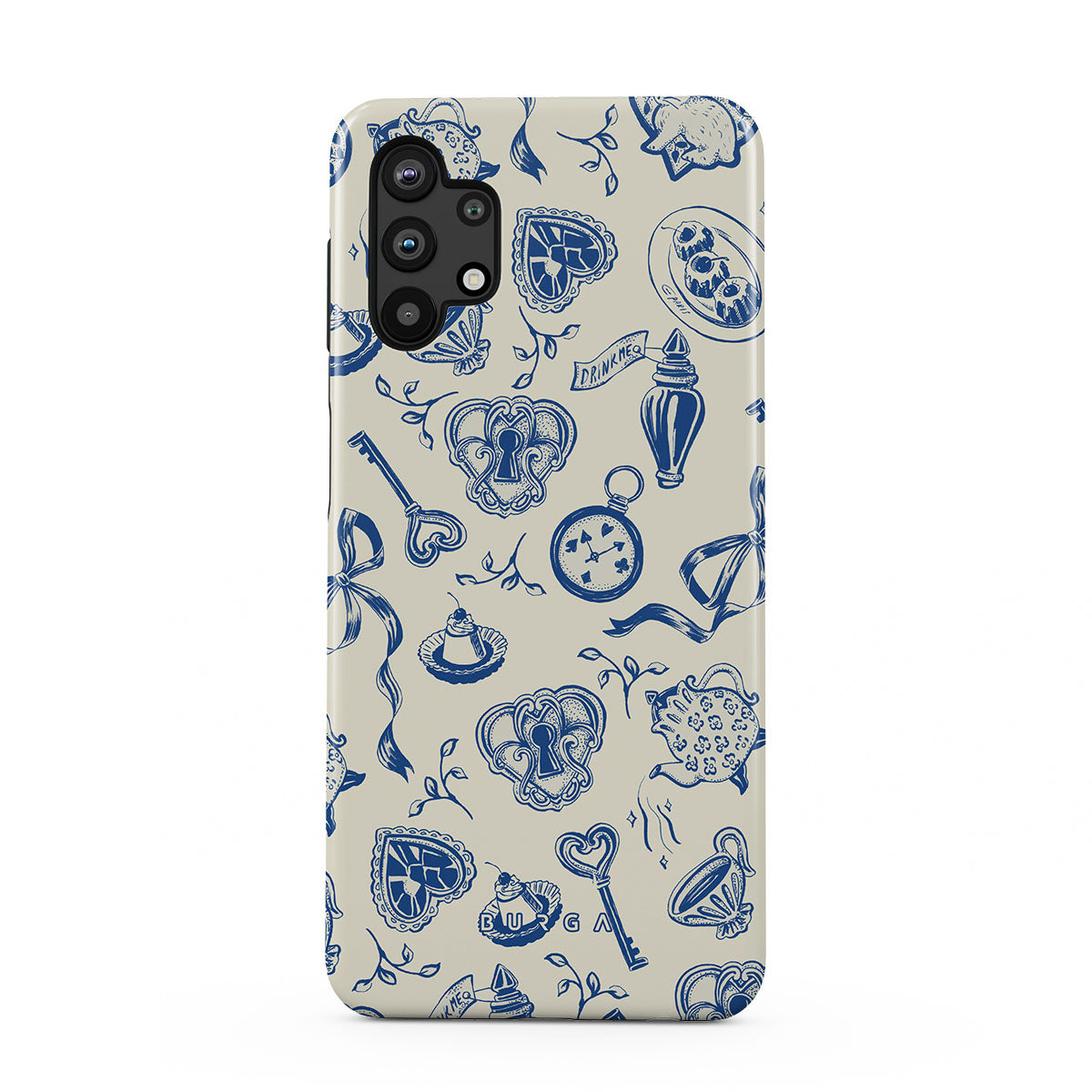 En este diseño: tazas de té, teteras, relojes de bolsillo, llave, corazones, cerámica, patrón azul y blanco.