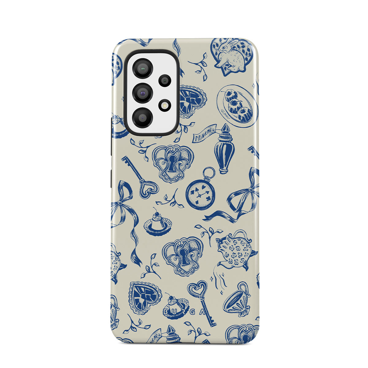 En este diseño: tazas de té, teteras, relojes de bolsillo, llave, corazones, cerámica, patrón azul y blanco.