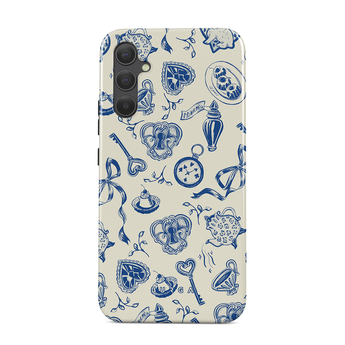 En este diseño: tazas de té, teteras, relojes de bolsillo, llave, corazones, cerámica, patrón azul y blanco.
