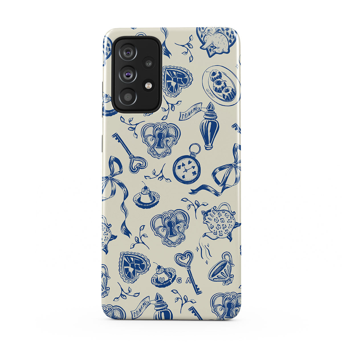En este diseño: tazas de té, teteras, relojes de bolsillo, llave, corazones, cerámica, patrón azul y blanco.