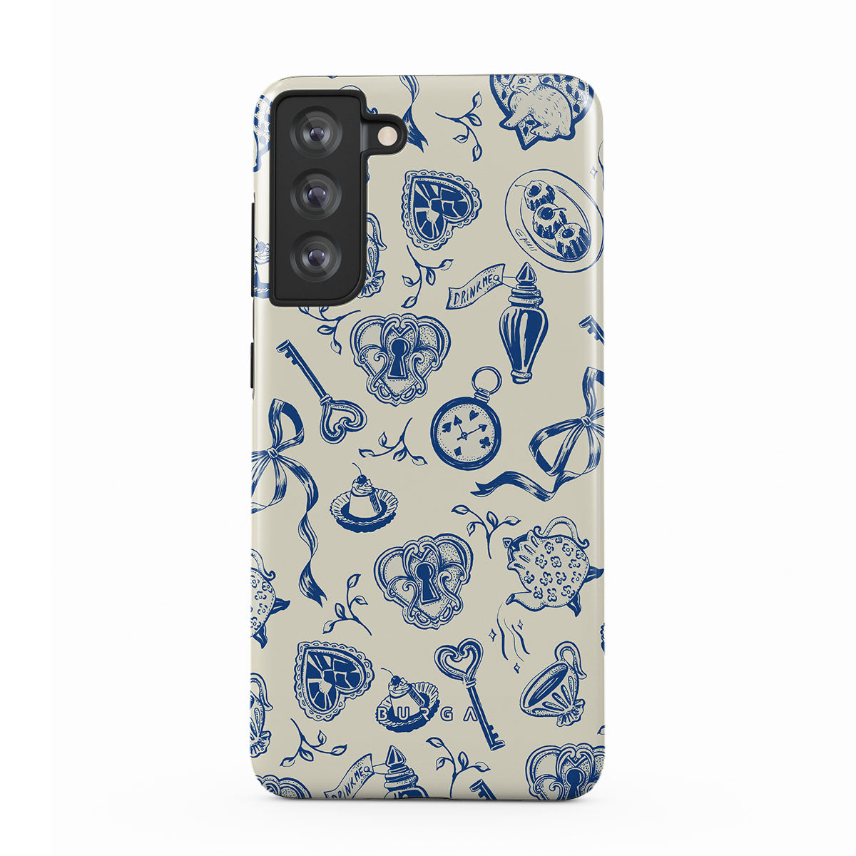 En este diseño: tazas de té, teteras, relojes de bolsillo, llave, corazones, cerámica, patrón azul y blanco.