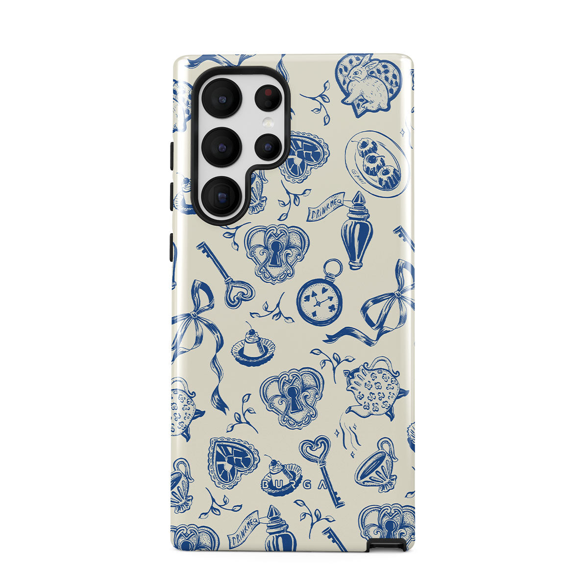 En este diseño: tazas de té, teteras, relojes de bolsillo, llave, corazones, cerámica, patrón azul y blanco.