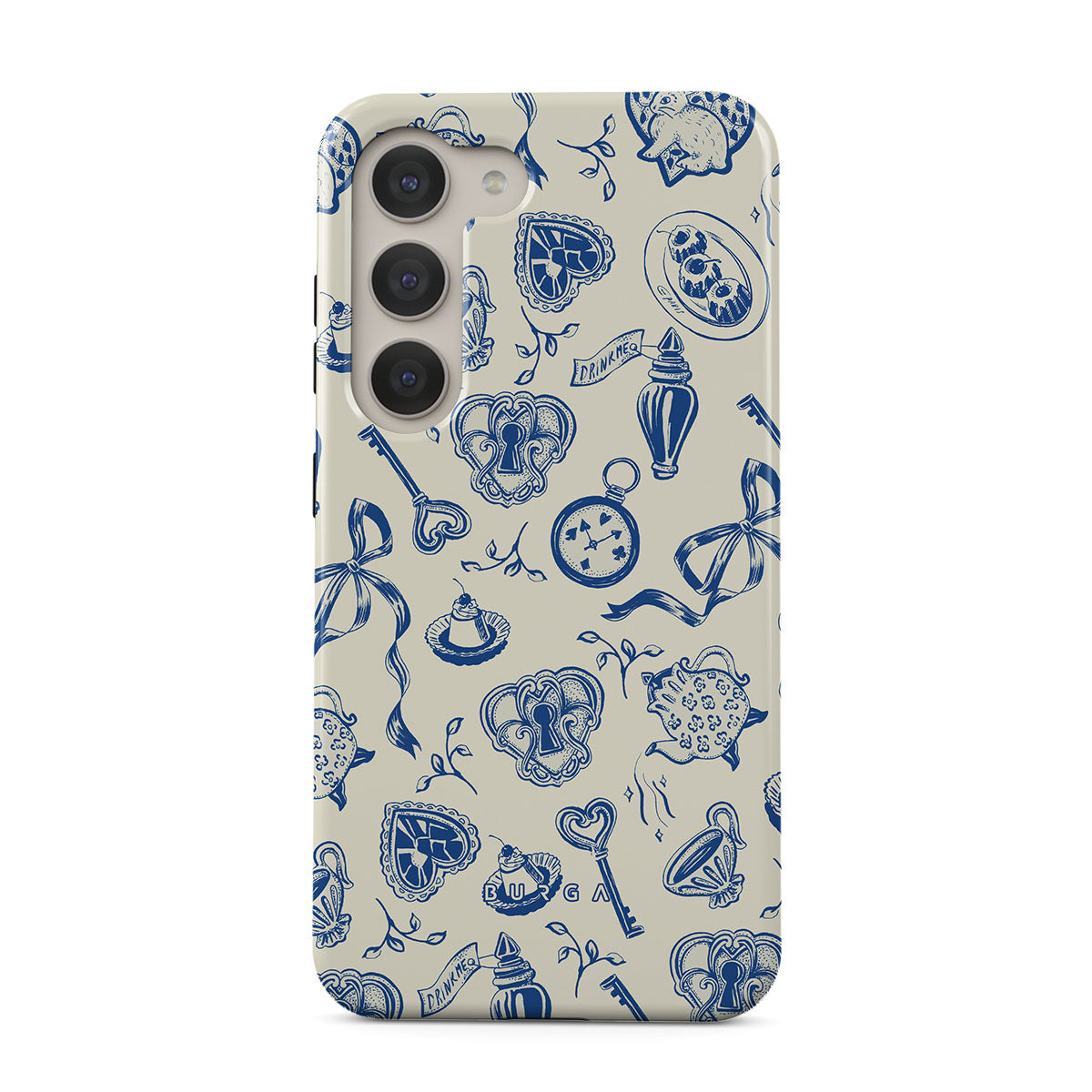 En este diseño: tazas de té, teteras, relojes de bolsillo, llave, corazones, cerámica, patrón azul y blanco.