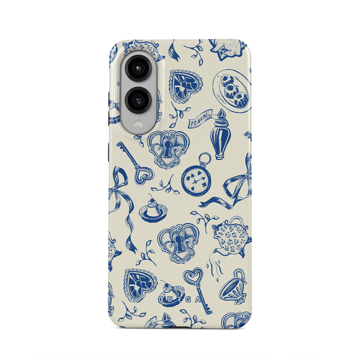 En este diseño: tazas de té, teteras, relojes de bolsillo, llave, corazones, cerámica, patrón azul y blanco.