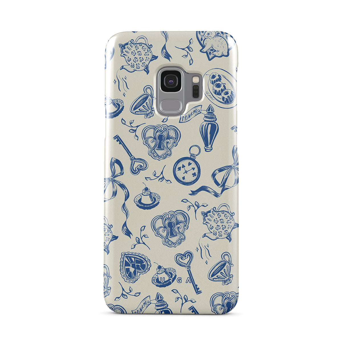 En este diseño: tazas de té, teteras, relojes de bolsillo, llave, corazones, cerámica, patrón azul y blanco.