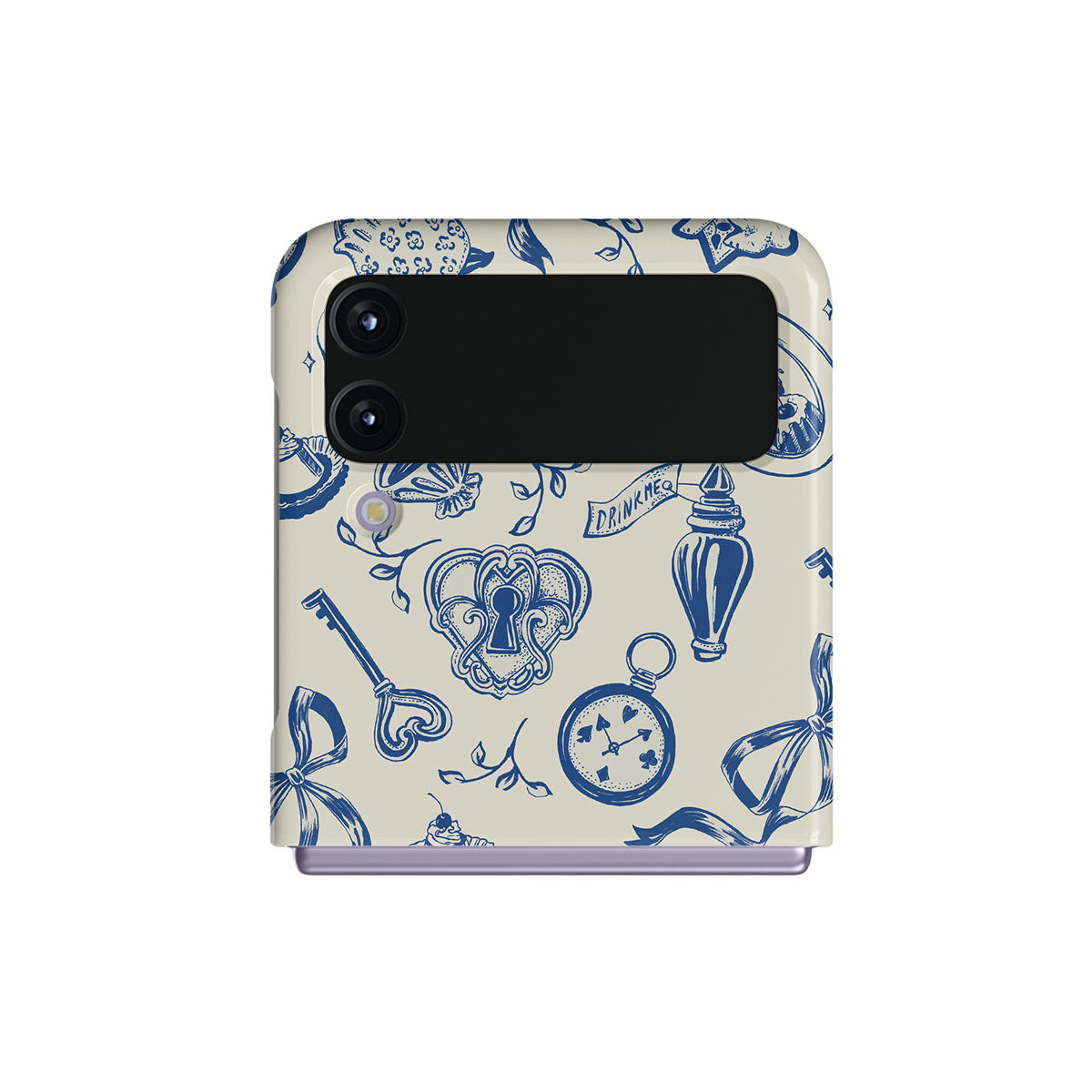 En este diseño: tazas de té, teteras, relojes de bolsillo, llave, corazones, cerámica, patrón azul y blanco.