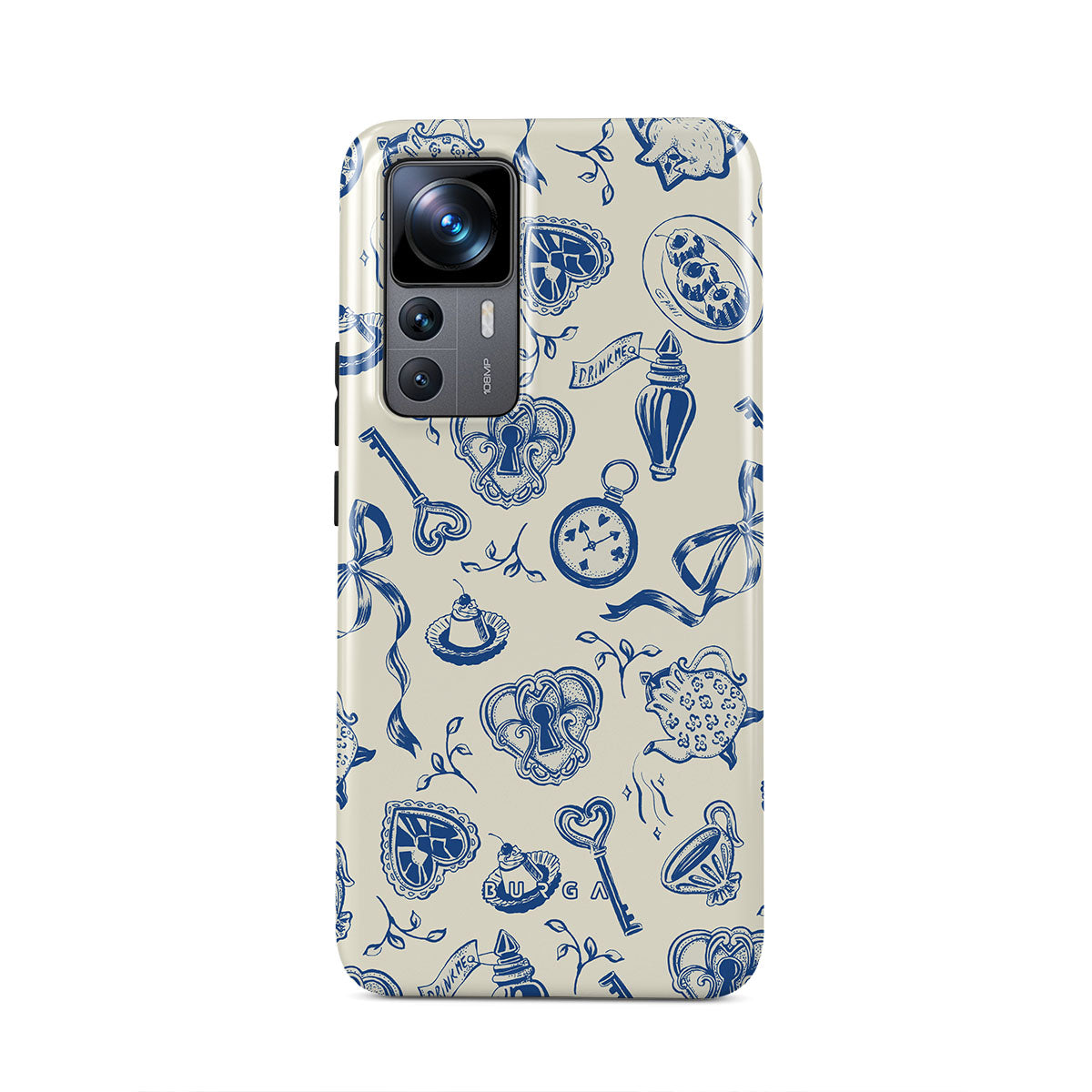 En este diseño: tazas de té, teteras, relojes de bolsillo, llave, corazones, cerámica, patrón azul y blanco.