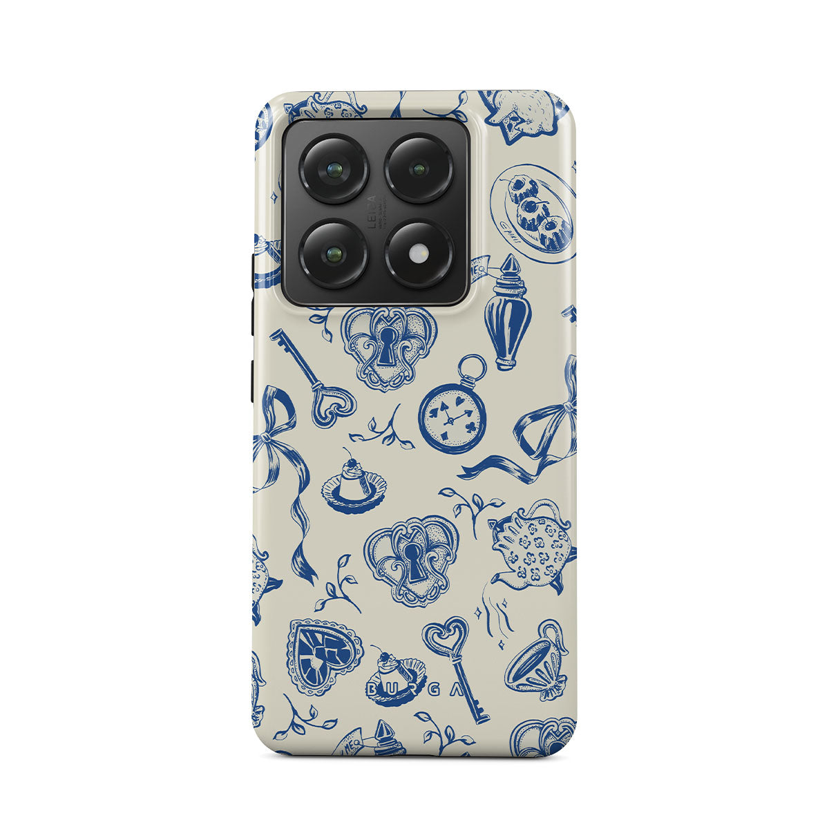En este diseño: tazas de té, teteras, relojes de bolsillo, llave, corazones, cerámica, patrón azul y blanco.