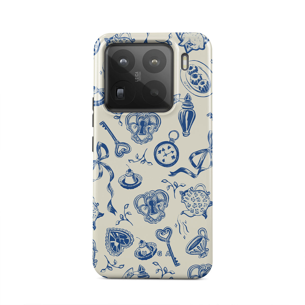 En este diseño: tazas de té, teteras, relojes de bolsillo, llave, corazones, cerámica, patrón azul y blanco.