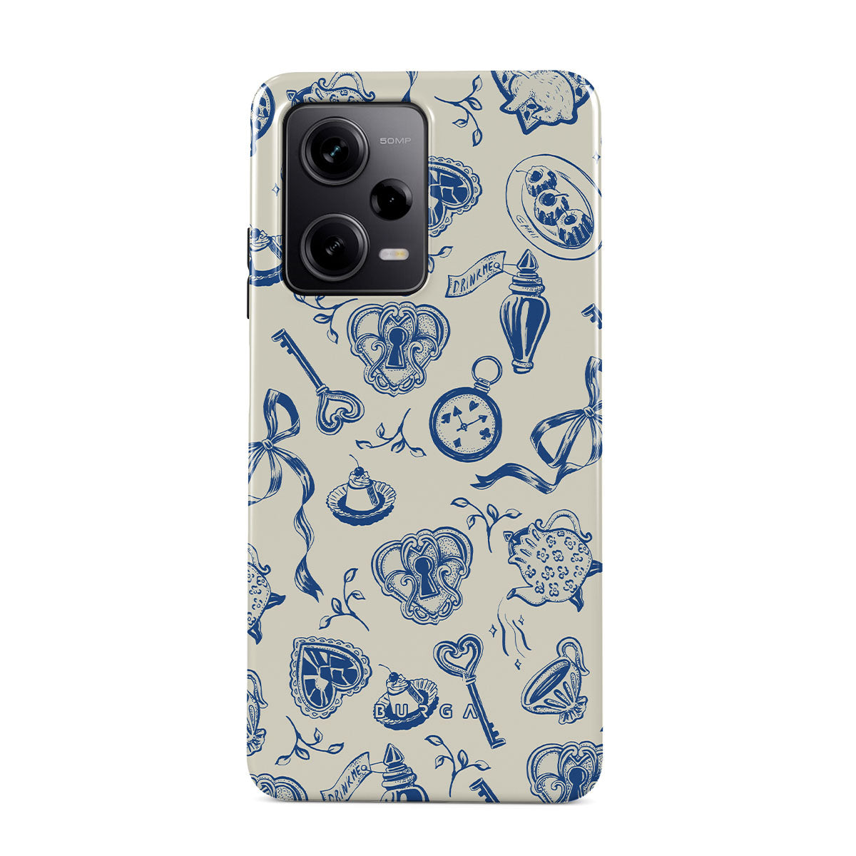 En este diseño: tazas de té, teteras, relojes de bolsillo, llave, corazones, cerámica, patrón azul y blanco.